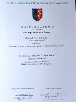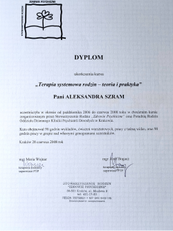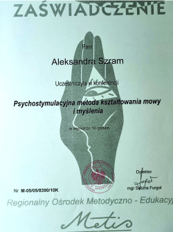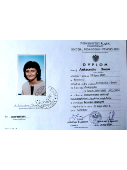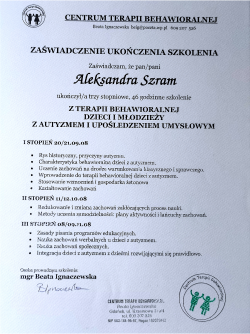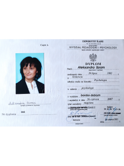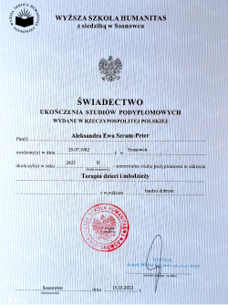 Jestem psychologiem oraz terapeutą dzieci i młodzieży a także pedagogiem specjalnym. Ukończyłam 5-letnie studia magisterskie na kierunku Psychologia na Uniwersytecie Śląskim (specjalność psychologa dzieci i młodzieży), 3-letnie studia licencjackie na Uniwersytecie Śląskim na kierunku Pedagogika Wczesnoszkolnej, 2letni kurs „Terapia rodzin – teoria i praktyka”, kurs kwalifikacyjny z zakresu oligofrenopedagogiki oraz podyplomowe studia „Terapia dzieci i młodzieży” w Wyższej Szkole Humanitas. Brałam udział w licznych szkoleniach i kursach doskonalących.
